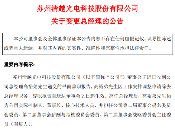 近日,清越科技(维权)发布公告称,公司董事会于近日收到总经理高裕弟递交的书面辞职报告,高裕弟因工作安排调整申请辞去总经理职务,辞职报告自送达董事会之日起生效。