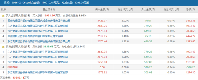 从龙虎榜数据上看,固德电材今日榜单中,游资常见席位国泰海通证券重庆观音桥步行街位居买一席位,净买额达3412万元,另有三个“拉萨”席位分别净买入1903万元、2029万元、1576万元。此外,另有一个营业部净买额近2475万元。而在卖出榜单中,一席机构席位位居卖四席位,净卖额达570万元。