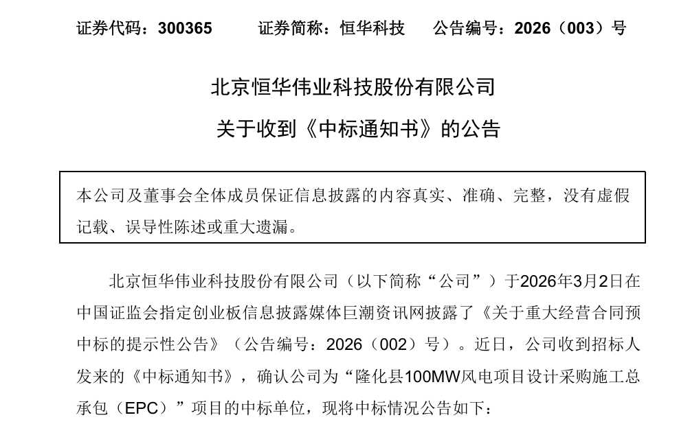 3月6日,北京恒华伟业科技股份有限公司(以下简称“恒华科技”或“公司”)发布《关于收到〈中标通知书〉的公告》。