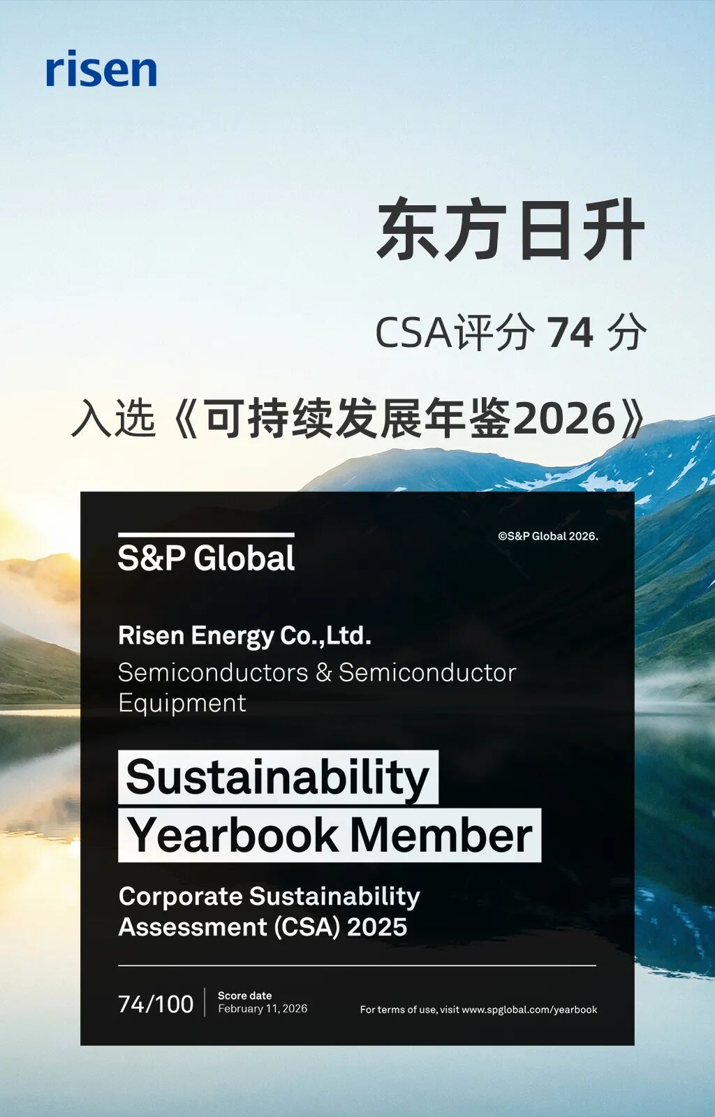 近日, 东方日升继去年首次入选标普全球《可持续发展年鉴(中国版)2025》后,再度荣幸入选标普全球《可持续发展年鉴2026》。凭借在可持续发展领域的持续投入与系统化实践,公司以74分的企业可持续发展评估(CSA)成绩位列光伏行业全球TOP 2,可持续发展综合实力再获国际权威机构认可。