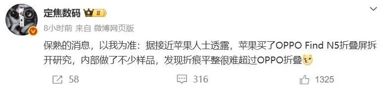 这些专利技术的积累,最终转化为量产产品上出色的折痕控制表现,其工艺水准甚至引来了行业巨头的关注。根据博主“定焦数码”透露的信息,苹果已购入OPPO Find N5进行拆解研究。但在内部制作多款样机对比后发现,在折痕平整度这个核心指标上,苹果始终无法超越。