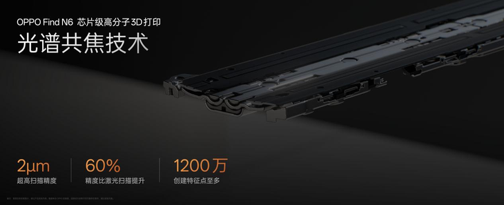但即便 0.1mm 只是一根头发丝的厚度,依然没有达到 OPPO 对久用平整的追求。为了解决千变万化的 0.1 mm 难题,OPPO 突破了传统精密加工的瓶颈,带来行业首个芯片级高分子 3D 打印技术。该技术通过 2μm 超高精度光谱共焦扫描,明确每条铰链的起伏情况,再配合 5pL 级高分子 3D 打印、毫秒级固化的全流程工艺,抹平影响铰链平整的最后 0.1 mm,让折叠屏铰链的微型「天堑」变为「坦途」。OPPO 甚至专为实现铰链平整打造了一条生产线,让每条独一无二的铰链都同样平整,真正做到千轴归一、千屏一效。