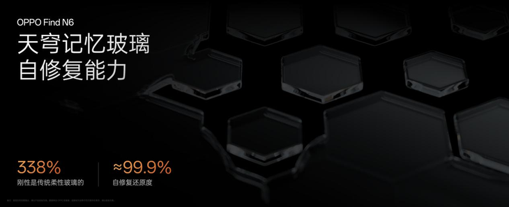 未来的折叠屏玻璃,不仅要够「柔」,更需要「刚」。OPPO Find N6 搭载了全新升级的天穹记忆玻璃,其刚性是传统柔性玻璃的 3 倍以上,当它被弯折再展开的时候,具备 99.9% 的自修复还原度。如同记忆枕头一般,在弯折后能够快速自动回弹、修复折痕。而且这种自修复能力极具持久性,即便经历 60 万次折叠,依然能保持稳定,成为屏幕久用平整的核心保障。