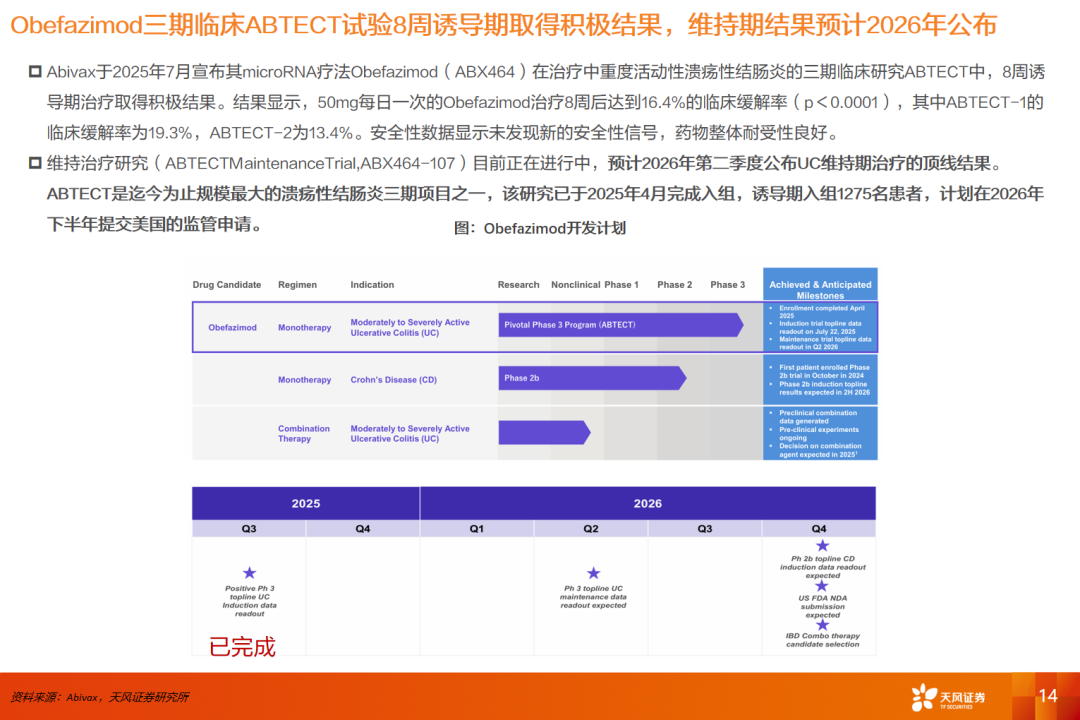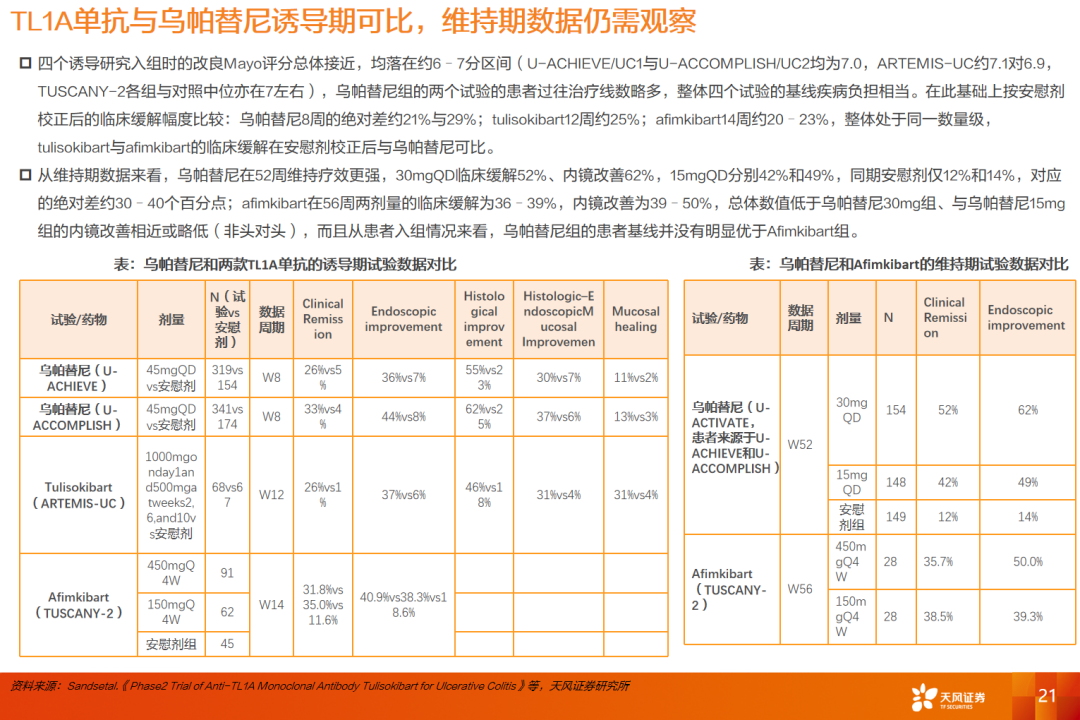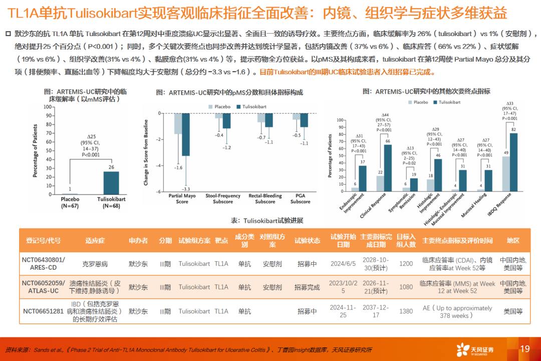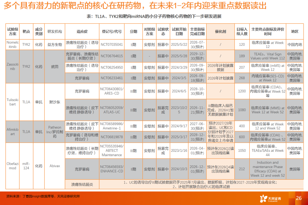 从在研方向看,当前IBD药物的研发靶点主要集中在TL1A、TYK2等主线。其中,TL1A 作为新一代核心炎症通路靶点,已在全球范围内获得高度验证,赛道内已产生两笔具有标志性意义的大额BD交易(默沙东108亿美金收购Prometheus,罗氏72.5亿美金收购Telavant),多家跨国药企均已深度布局,显示其在难治及生物制剂经治人群中的潜在价值。TYK2抑制剂与乌帕替尼同属JAK家族,疗效已在临床上得到充分验证,但TYK2抑制剂具备更优的安全性窗口,从其他适应症中读出的安全性数据也验证了这一点。我们认为TYK2是具备高效安全的潜力的靶点。武田的TYK2抑制剂正在开展UC和CD的II期临床试验,预计2026年读出数据,值得重点关注。此外,PDE4抑制剂已陆续出现临床数据读出,后续进一步数据更新同样值得期待。