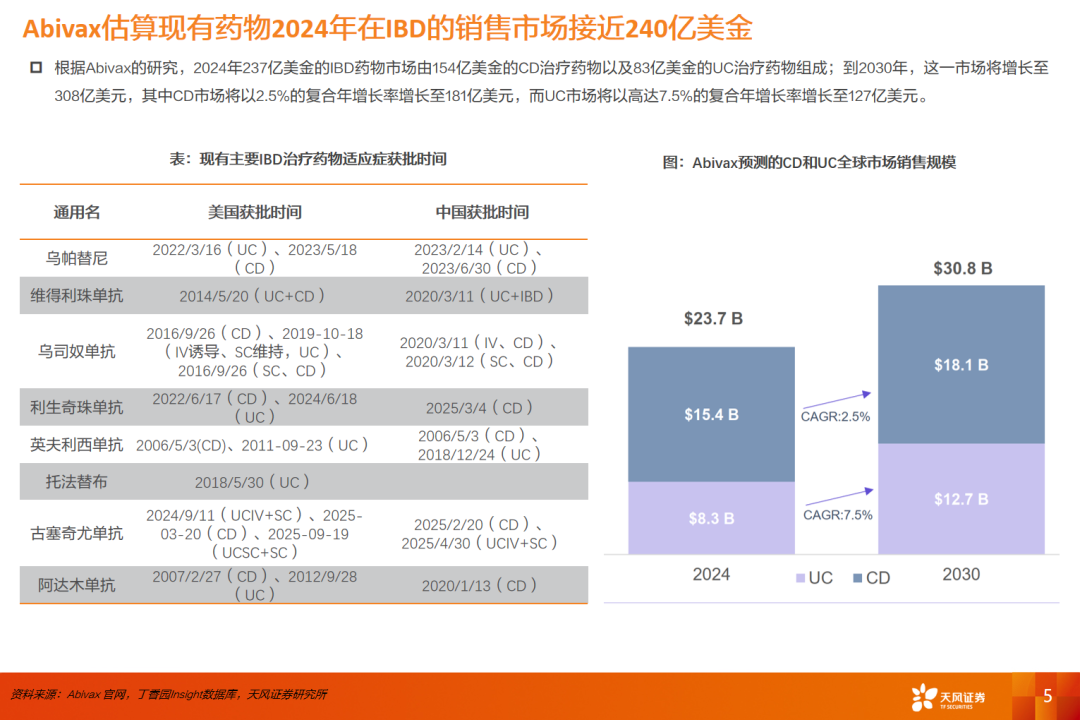 炎症性肠病(IBD,含溃疡性结肠炎UC/克罗恩病CD)对生活质量影响显著。全球层面近30年患者规模快速扩张,1990-2017年全球IBD患者数由约370万增至超过680万,增幅约85%。中国处在新病例增长阶段,患者增长更快:2021年中国IBD患者新增病例约2.49万;发病率1990-2019年由1.45/10万升至3.62/10万。2024年IBD患者数量接近91万人,并预计2025年患者数将达150万,由少见病走向常见病。在治疗格局上,一线仍以TNF-α单抗与整合素单抗为主(占比约八成),二线及后线JAK抑制剂占比显著抬升(2L约28%、3L约42%)。根据Abivax估算,2024年至2030年IBD药物市场有望从237亿美元增至308亿美元,其中UC增速更快。