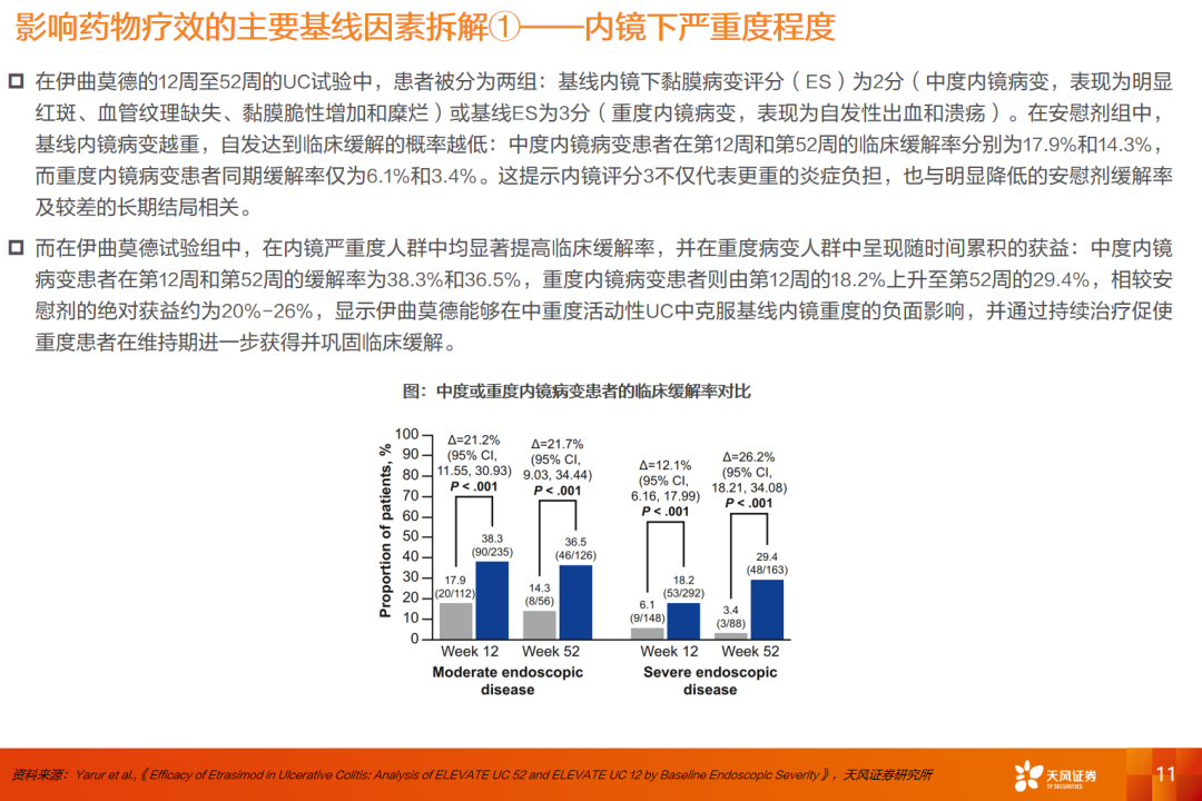 目前IBD的常见系统治疗药物主要包括生物制剂与口服小分子两大类:生物制剂方面以TNF-α抑制剂、IL-23p19单抗和α4β7单抗为代表;口服小分子方面则包括S1PR调节剂与JAK抑制剂。整体来看,TNF-α单抗起效较快,但容易出现耐药问题;JAK抑制剂乌帕替尼在临床缓解、内镜改善等关键终点具综合优势。在AGA指南中,也将托法替布、乌帕替尼、乌司奴单抗列为UC二线治疗的推荐常用高效药物,且乌帕替尼在UC诱导阶段安慰剂组调整后临床缓解率达21%-29%,高于其他两款药物的10%-13%;维持阶段乌帕替尼则为30%-40%左右,其他两款则为14%-30%。但JAK类药物被FDA标上感染/肿瘤/心血管/血栓的黑框警告,在安全性上需要注意。