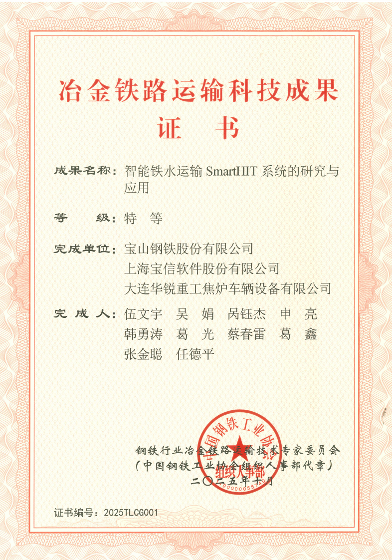 “冶金铁路运输科技创新成果奖”由中国钢铁工业协会、冶金铁路运输技术专家委员会联合主办,是冶金铁路领域科技创新的最高奖项,旨在遴选破解行业痛点、引领技术变革的重大成果。本次评选历经多轮技术评审、现场核验及专家论证,SmartHIT系统凭借技术创新和显著应用成效,从百余项申报成果中脱颖而出,彰显其在冶金铁路智能运输领域的标杆地位。