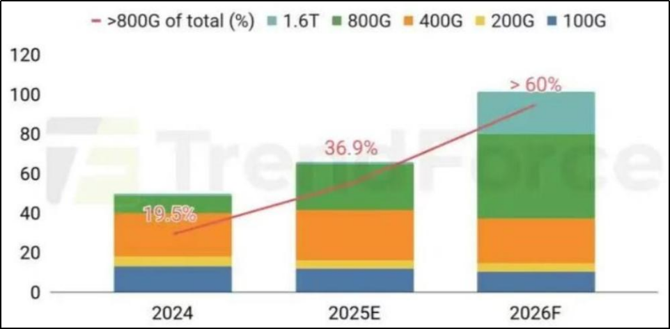 需求爆发+结构切换是订单外溢的驱动力。AI资本开支的持续加码与光模块速率的快速升级,构成了订单外溢的核心推手。市场预计AI推动下,全球光模块产业将从2025年约180亿美元,飙升至2028年的500亿美元;出货量则从2025年的4100万只,增长至2028年的9500万只,短短三年实现翻倍以上增长。更关键的是,市场结构正在发生颠覆性切换,高端产品正在成为绝对主力。从出货量数据来看,2025年400G光模块出货1500万只、800G出货2000万只、1.6T出货仅250万只;而到2026年,这一格局将彻底反转,400G出货降至900万只,800G飙升至4000万只,1.6T更是突破2000万只;2027年,1.6T出货量将进一步攀升至5000万只,与800G共同占据行业绝对主导地位。如下图所示,2024-2026年全球光收发模块出货结构中,800G以上产品占比由2024年的19.5%升至2025年的36.9%,并在2026年超过60%。