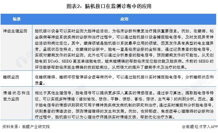 在监测诊断领域,应用脑机接口技术可实现神经生理监测、睡眠监测、情绪状态和注意力监测等。