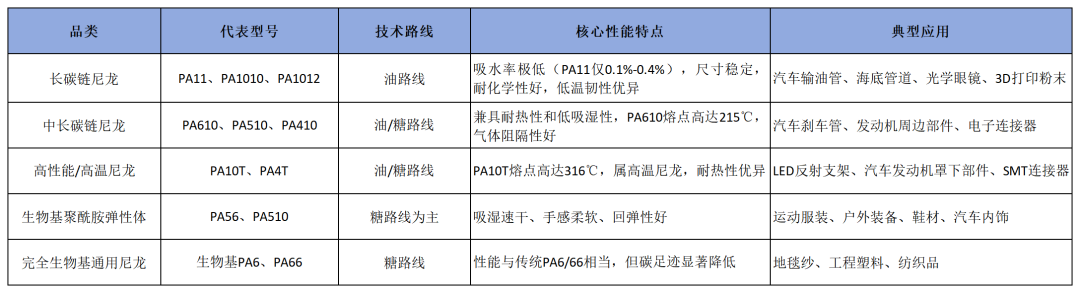 目前生物基尼龙主要分为两大技术路径。其中,油路线以蓖麻油、油酸等植物油为原料,通过酯交换、高温裂解、氨解等化学反应制备尼龙单体,代表产品有PA11、PA1010、PA610、PA10T等;糖路线以葡萄糖、纤维素、淀粉等为原料,通过微生物发酵或化学转化制备尼龙单体,代表产品有PA56、PA46、PA4、生物基PA6等,原料来源更广,合成生物学技术突破快。