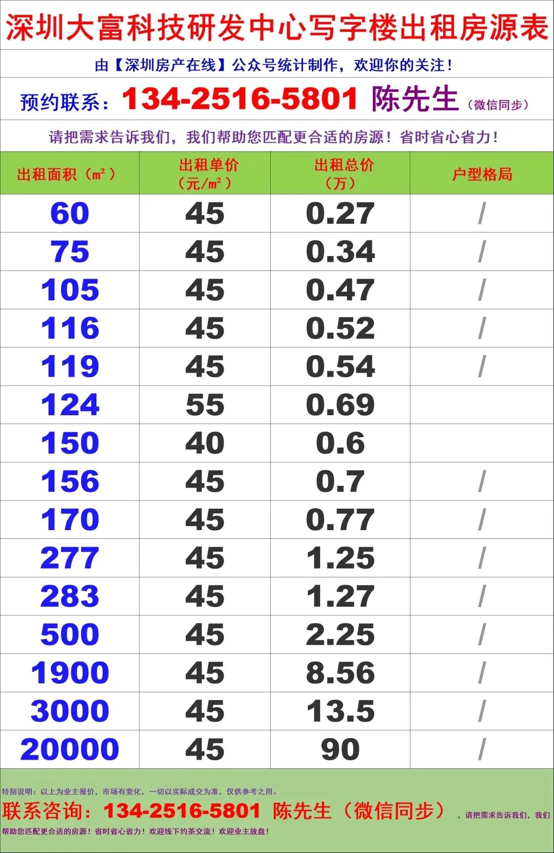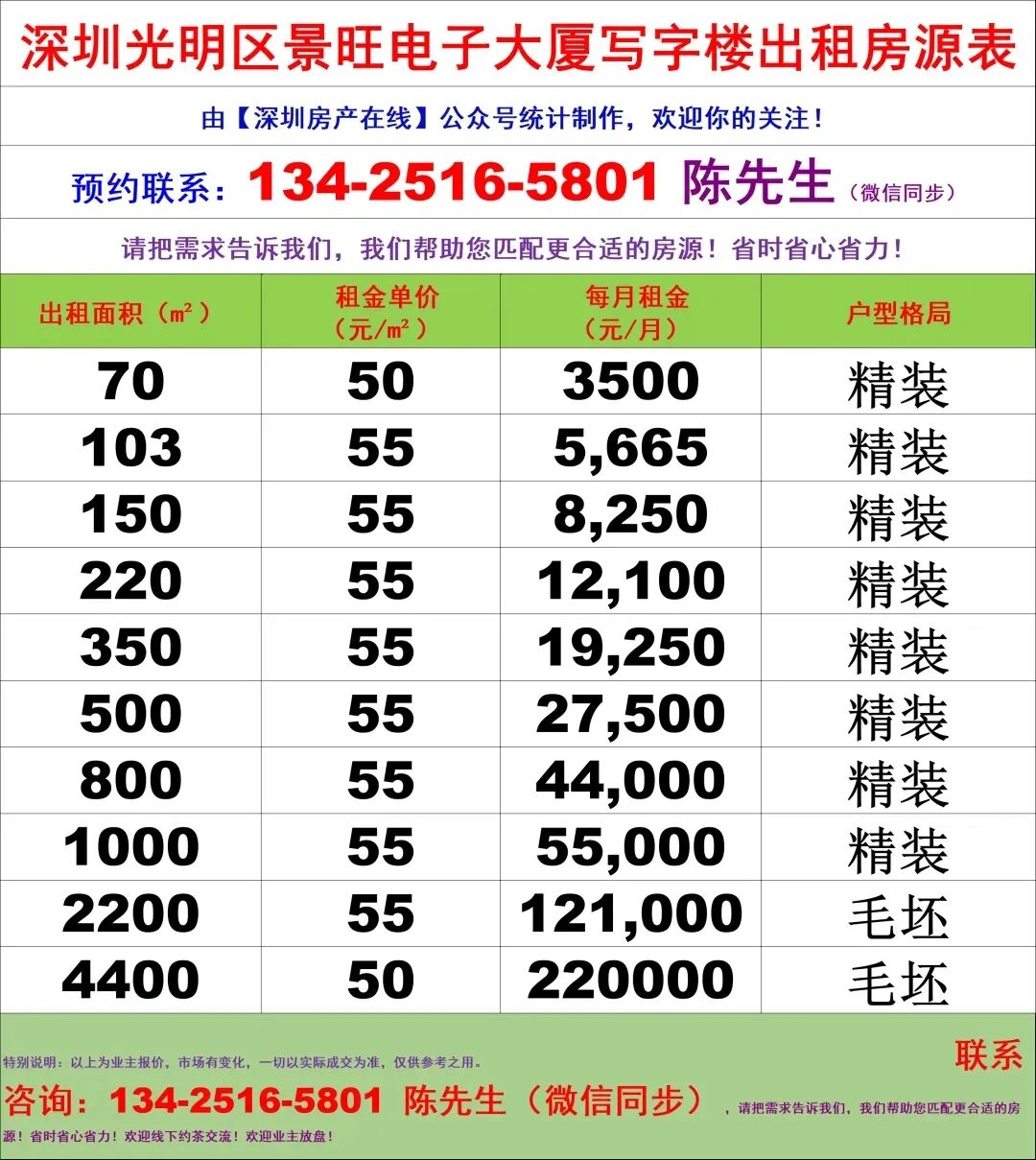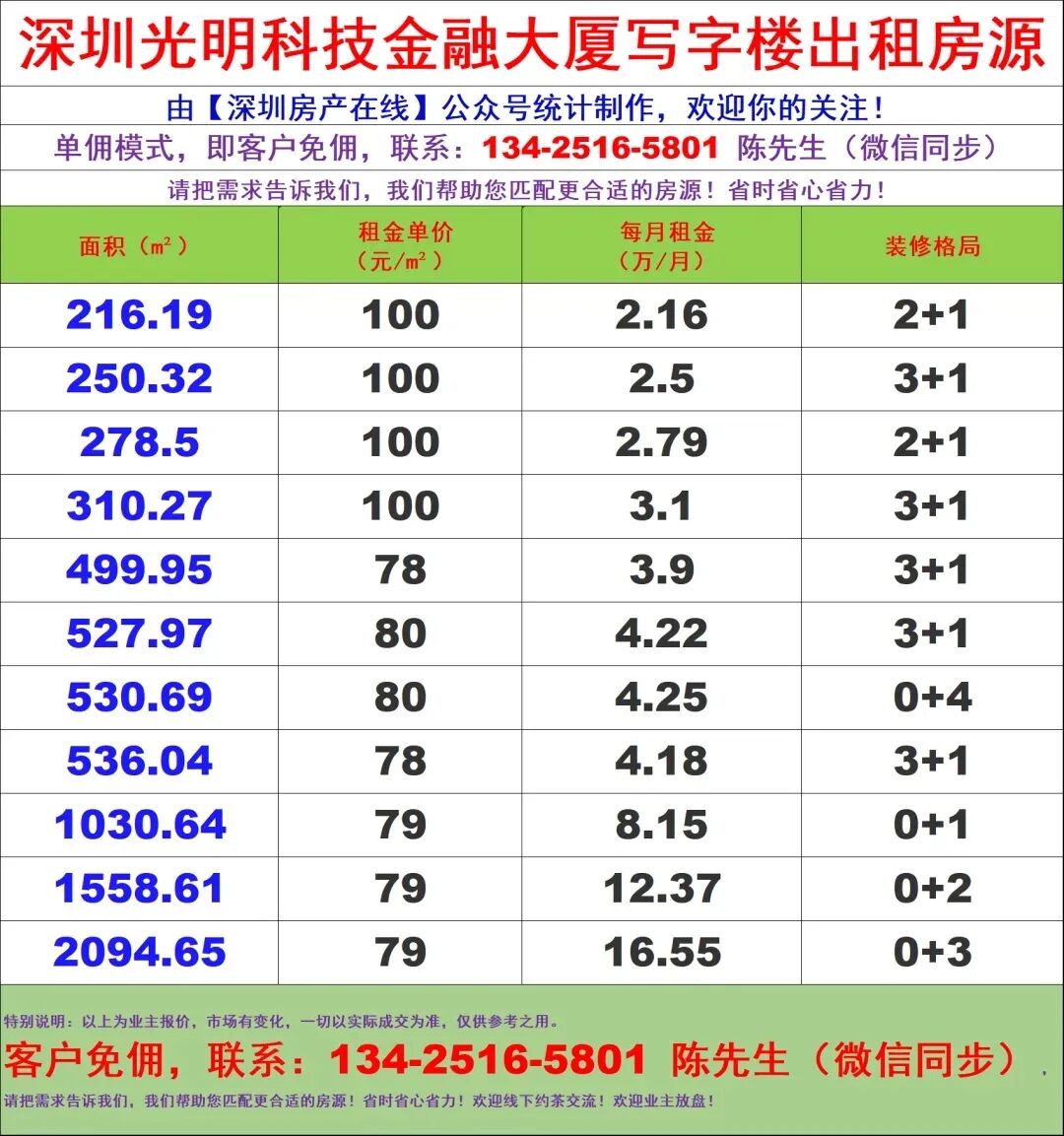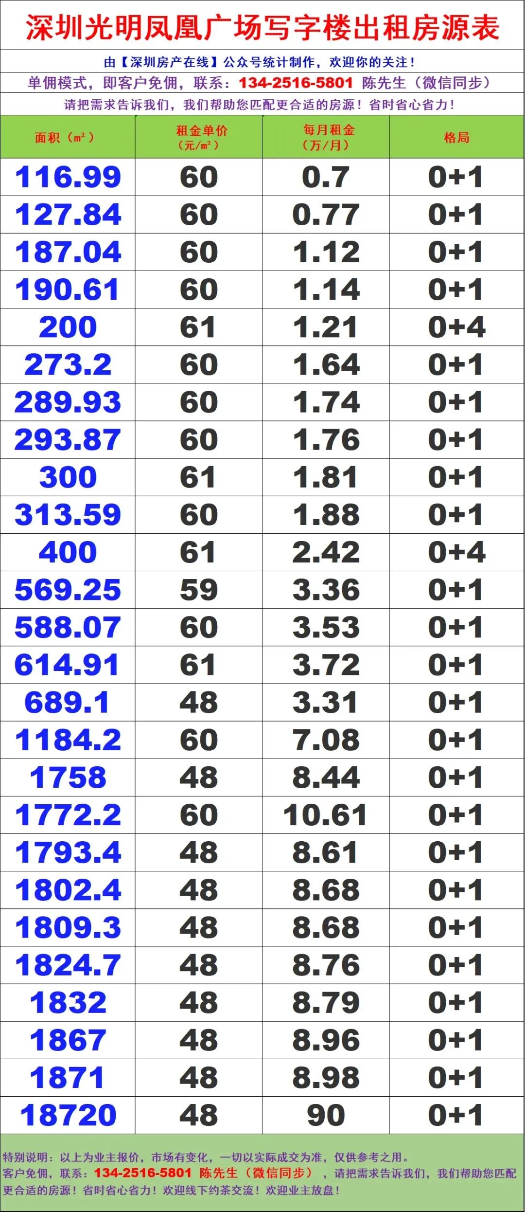 深圳光明区凤凰城写字楼办公室租赁租金价格表