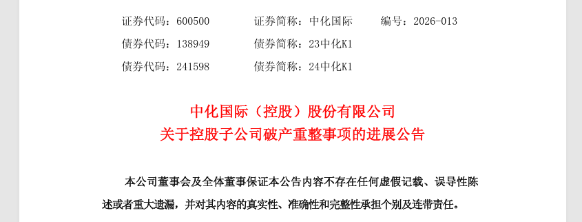 近日,中化国际发布《关于控股子公司破产重整事项的进展公告》。