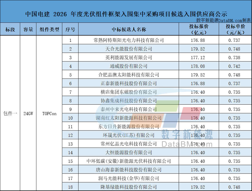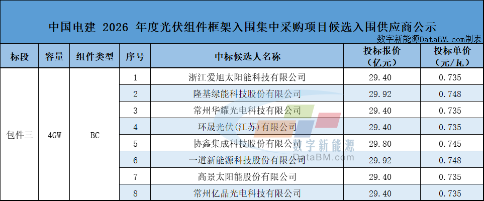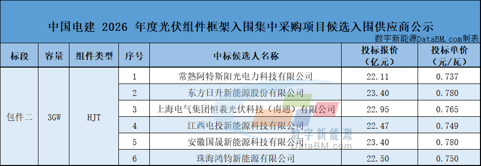 3 月 18 日,中国电建 2026 年度光伏组件框架入围集中采购项目候选入围供应商公示。