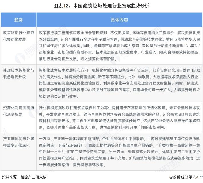中国建筑垃圾处理行业正处于加速转型期,呈现出政策规范化、技术智能化、利用高值化和产业链协同化四大趋势。政策层面不断完善全链条管控,通过费用纳入工程造价、电子联单和北斗监管等手段提升行业合规水平,推动市场向集约化、规模化企业集中。技术方面,智能化分拣、物联网和大数据等技术广泛应用,移动式和模块化装备进一步提升处理效率与灵活性。资源化利用正从传统低值回填向高值化方向发展,高端再生建材、3D打印应用及碳足迹认证体系逐步建立,显著提升产品附加值和市场认可度。产业链协同不断深化,上下游企业加强合作,形成完整的收集—运输—处理—利用体系,同时建筑固废与工业固废协同处置、井下充填等多元化模式不断拓展,为行业提供更高效、更可持续的发展路径。