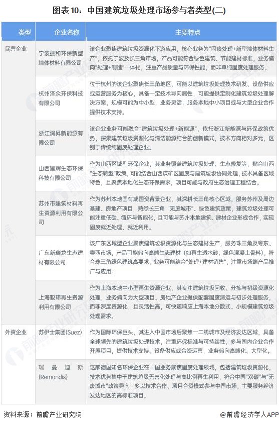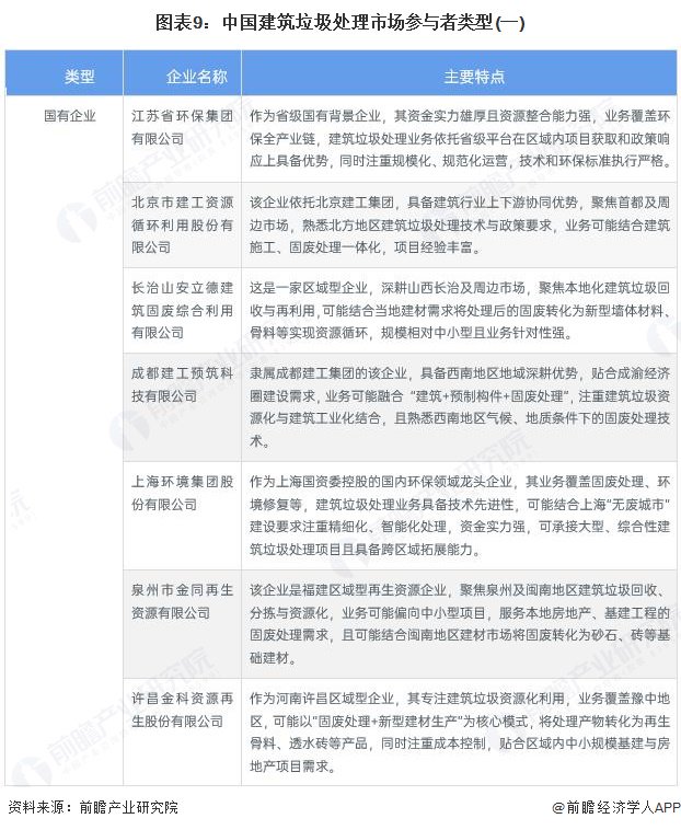 中国建筑垃圾处理市场参与者类型主要包括国有企业、民营企业和外资企业。建筑垃圾处理产业各类型企业中的代表性企业及其主要特点如下: