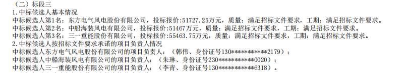 中标候选人第1名:东方电气风电股份有限公司,投标报价:51727.25万元,质量:满足招标文件要求,工期:满足招标文件要求。