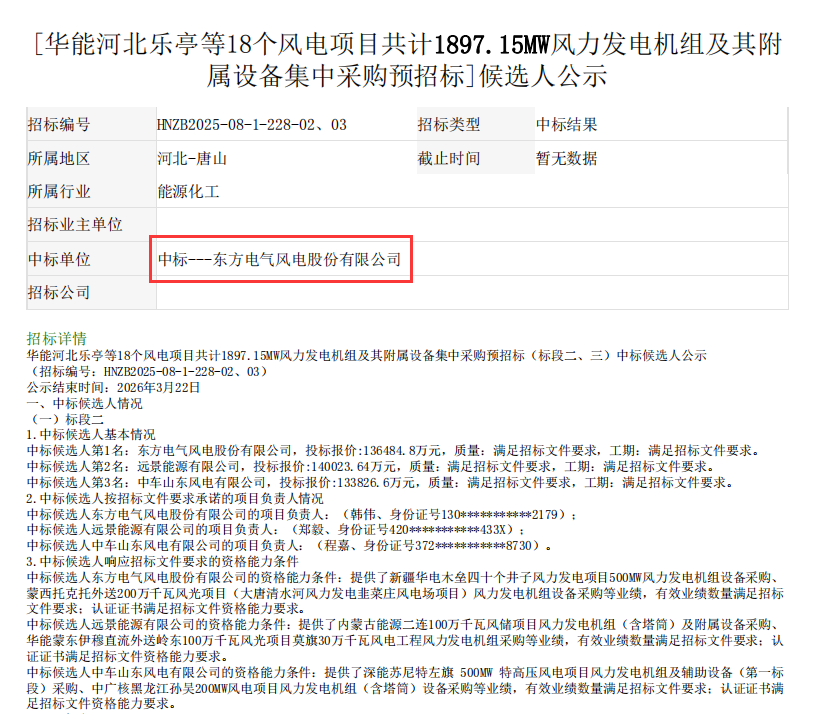 3月19日,华能河北乐亭等18个风电项目共计1897.15MW风力发电机组及其附属设备集中采购预招标(标段二、三)中标候选人公示。公示结果显示: