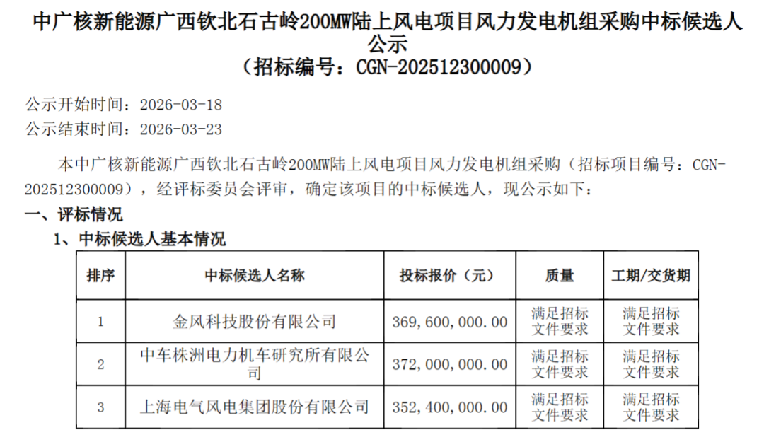 3月18日,中广核电子商务平台发布中广核新能源广西钦北石古岭200MW陆上风电项目、中广核新能源贵州龙里红岩、团结、乐阳247.5MW陆上风电项目风力发电机组采购中标候选人公示的公告。