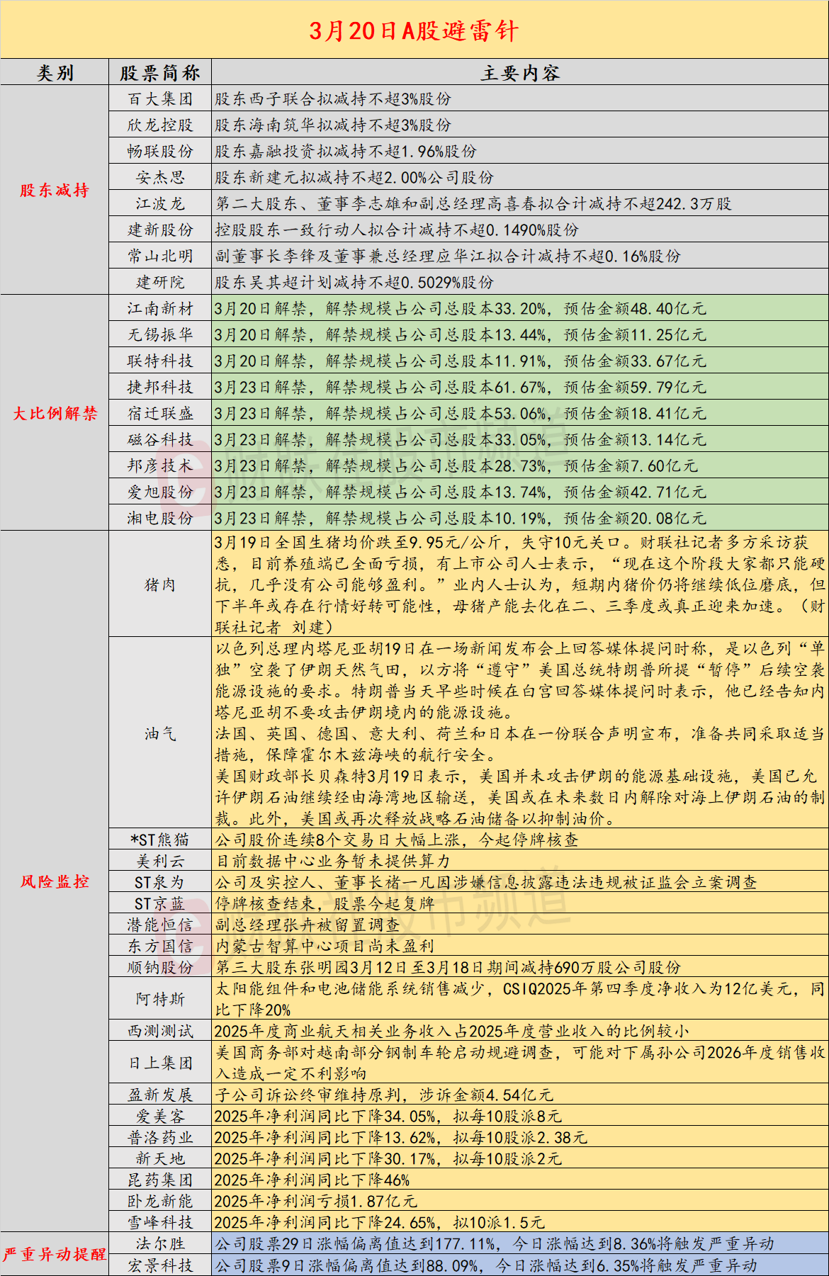 导读:财联社3月20日投资避雷针,近日A股及海外市场潜在风险事件如下。国内经济信息方面包括:1)国内商品期市夜盘收盘多数下跌,能源品跌幅居前;2)生猪均价3月19日跌破10元/公斤,深度亏损或倒逼产能去化加速;公司方面重点关注包括:1)8连板*ST熊猫公司股价连续8个交易日大幅上涨,今起停牌核查;2)2连板美利云表示,目前数据中心业务暂未提供算力;海外市场重点关注包括:1)美股三大指数集体收跌,黄金矿业股走低;2)内塔尼亚胡称,以方将“暂停”空袭伊朗能源设施。