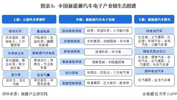 从新能源汽车电子产业生态图谱来看,上游被动元件主要厂商包括风华高科、顺络电子、三环集团等,集成电路生产企业包括沪电股份、生益科技等,半导体元件包括紫光国微、斯达半导、韦尔股份等,新能源汽车电机生产企业包括弗迪动力、特斯拉等;中游自动驾驶系统集成商包括百度、深蓝科技等,车联网系统集成商包括东软集团、华为等,舒适域系统集成商包括诺博科技、华为等,智能座舱系统基础商包括德赛西威、华阳集团等,动力系统集成商包括科博达、欣旺达等。