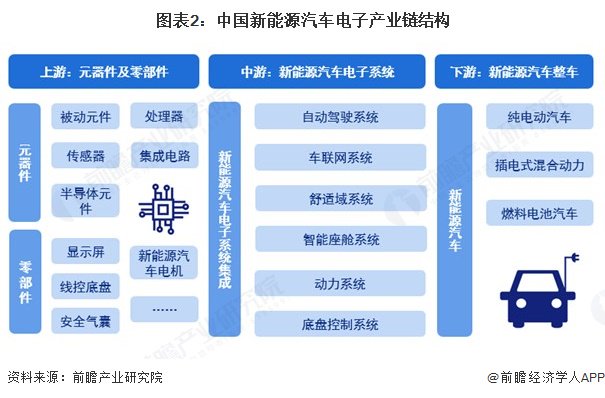 新能源汽车电子产业链上游为元器件及零部件,元器件包括被动元件、处理器、传感器、集成电路、半导体元件等,零部件包括显示屏、新能源汽车电机、安全气囊等;产业链下游主要是新能源汽车整车生产企业,涵盖纯电动汽车、插电式混合动力汽车、燃料电池汽车。