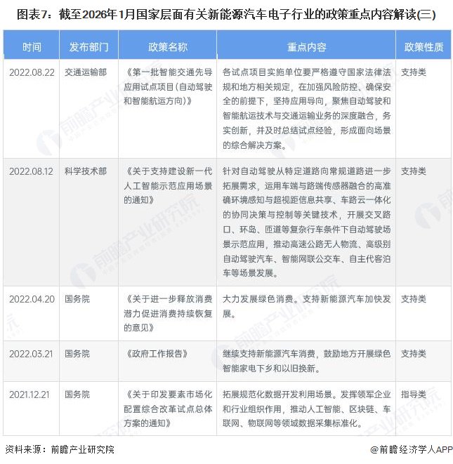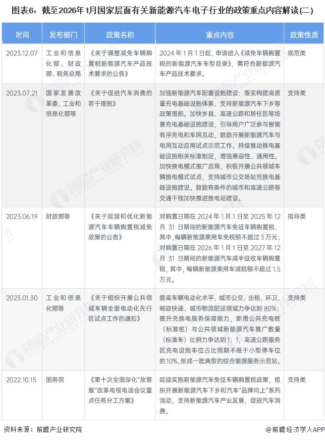 随着我国新能源汽车的快速发展,行业主管部门出台了一系列涉及智能制造、新能源汽车领域产业引导、消费刺激的有关政策,为新能源汽车电子相关产业的发展提供了良好的政策环境和强有力的政策支持。截至2026年1月我国新能源汽车电子行业重点政策如下: