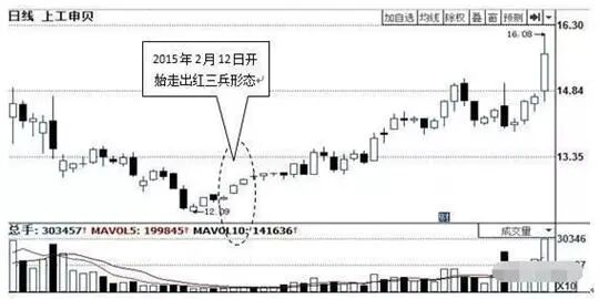 如上图所示,在深度下跌之后,上工申贝的股价于2015年2月12日、13日和16日(14日、15日周末休市)这三个连续的交易日里形成了红三兵形态。