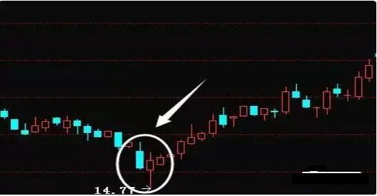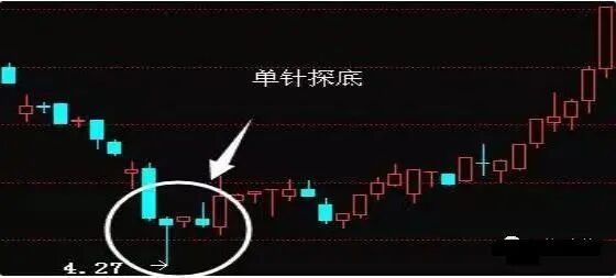 单针探底这种形态属于比较经典的形态,多数是主力吸筹的动作,下影线的长度要求是长于实体部分。见下图: