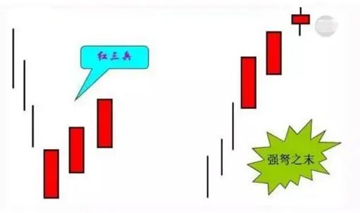 红三兵是连续收出三根阳线的K线组合。它是一种很常见的K线组合,多数出现在底部区域,偶尔也会出现在上升趋势中。若股价出现红三兵K线组合时,则意味着股价后市上涨的概率较大。如下图:
