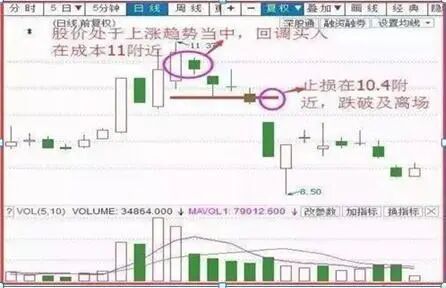 如上图,股价处于放量上涨的趋势当中,追高买入在11块附近,此时要带好止损比如10.4,如果后期跌破止损位,就说明自己趋势判断失误,果断止损纠正错误以免更大的损失。