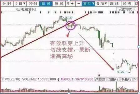 如上图所示,股价前期一直处于上涨趋势线上方运行,在高位回踩支撑线时有效跌穿趋势线,此时上涨趋势的形态被破坏,投资者应该果断出局,以免面临更大的损失。