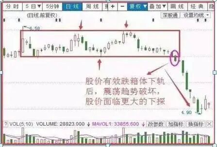 如上图所示,股价在经历较长时间的箱体盘整后,实体阴线跌穿下方平台支撑,震荡箱体遭受了破坏,股价将面临新一轮的下探。
