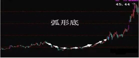 弧形底主要分为两种,一种是K线弧形底,另一种是成交量弧形底,两种情况一起出现的成功率会更加高。同样,弧形底以大阳线突破了颈线,成交量方法,反转就成立了。如下图: