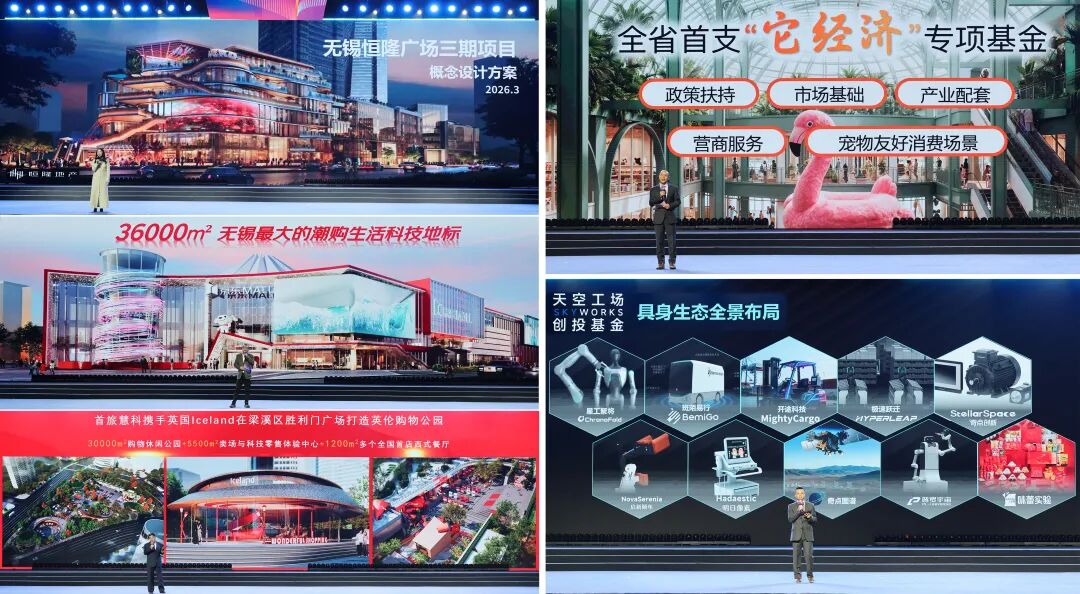 现场发布了恒隆广场三期、无锡京东MALL、Iceland英伦购物公园、梁溪宠物谷、天空工场科技生活旗舰店等一批涵盖时尚消费、科技生活、宠物友好、生态空间等领域的旗舰型项目。