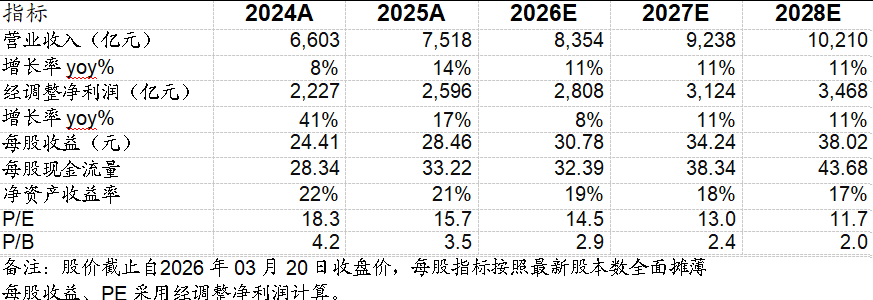 事件:公司发布2025年年报。2025年,公司实现总收入7518亿元,同增14%;Non-IFRS净利润2596亿元,同增17%。其中4Q25,公司实现总收入1944亿元,同增13%;Non-IFRS经营利润695亿元,同增17%;Non-IFRS净利润647亿元,同增17%。