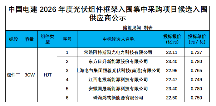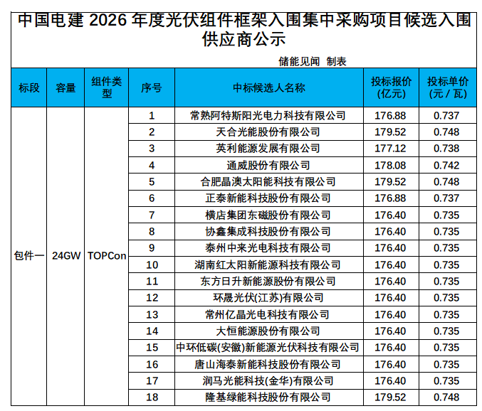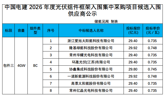 3月18日,中国电建2026年度光伏组件框架入围集中采购项目候选入围供应商公示。