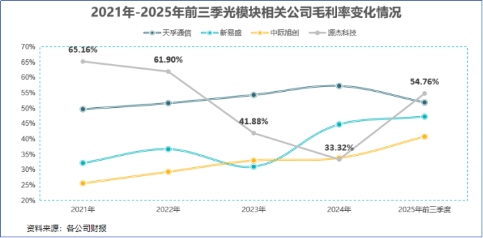 因此,光模块产业链里,基本呈现出产品越靠近上游、公司盈利能力越强的规律。2025年前三季度,源杰科技毛利率高达54.76%,高过天孚通信。而天孚通信的盈利能力,又常年高于新易盛和中际旭创。