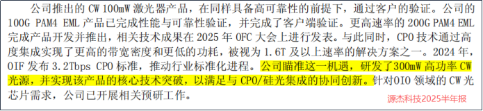 据源杰科技2025半年报披露,公司已经研发300mW高功率CW光源,实现产品的核心技术突破。
