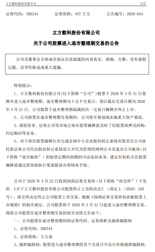 【退市整理】*ST立方:关于公司股票进入退市整理期交易的公告