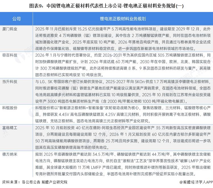 中国锂电池正极材料上市公司的锂电池正极材料企业普遍围绕高镍三元、磷酸铁锂、磷酸锰铁锂等主流技术路线加大产能投放与项目投资,同时将固态电池材料、钠离子电池正极、补锂剂等前沿领域作为重要研发与产业化方向。未来,中国锂电池正极材料代表性上市公司锂电池正极材料业务规划如下:
