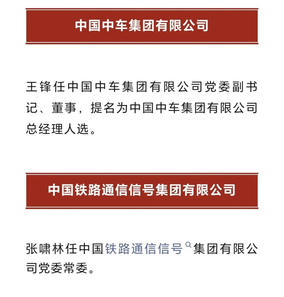 王锋任中国中车集团有限公司党委副书记、董事,提名为中国中车集团有限公司总经理人选。