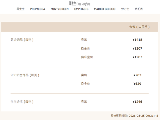 受此影响,国内部分品牌金饰价格也随之上调,克价重回1400元。周生生足金饰品报1418元/克,单日上涨68元;老凤祥报价1408/克,单日上涨63元/克。