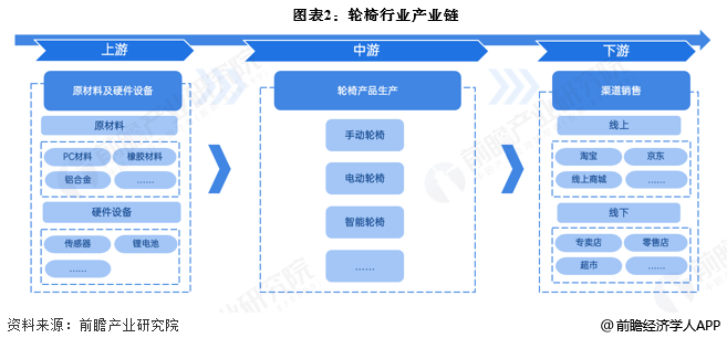 从产业链结构来看,轮椅的上游主要包括PC材料、橡胶材料、铝合金等原材料供应商以及传感器、锂电池等硬件设备厂商;中游主要为轮椅生产企业;下游领域主要包括专卖店、直营店、加盟店、线上商城等渠道。