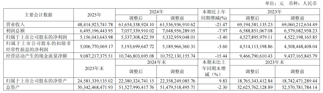公告显示,云天化2025年实现营业总收入484.15亿元,同比下降21.47%;归母净利润51.56亿元,同比下降3.40%;扣非净利润50.07亿元,同比下降3.60%;经营活动产生的现金流量净额90.87亿元,同比下降15.44%;基本每股收益2.8283元,加权平均净资产收益率21.87%。