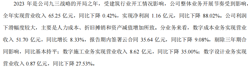 下面我们来看下管理层对2023年的看法:2023年是公司九三战略的开局之年,受建筑行业开工情况影响,公司整体业务开展节奏受到影响,其中公司基本盘数字成本业务营收51.7亿,同比增长8.33%,数字施工业务营收8.62亿同比下降35:可见公司的基本盘依旧是非常稳固,营收下降主要是数字施工业务。