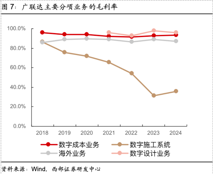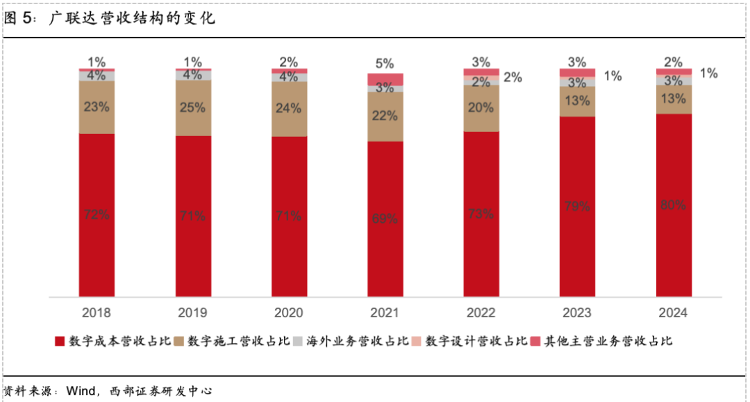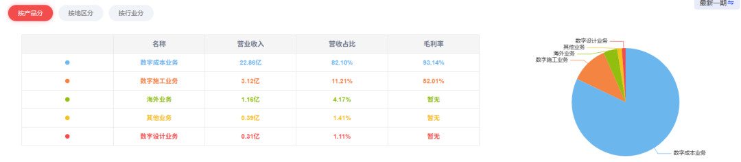 2024年报显示公司主营数字成本业务占总营收82.1%,数字施工业务占总营收11.21%,海外业务占总营收4.17%;