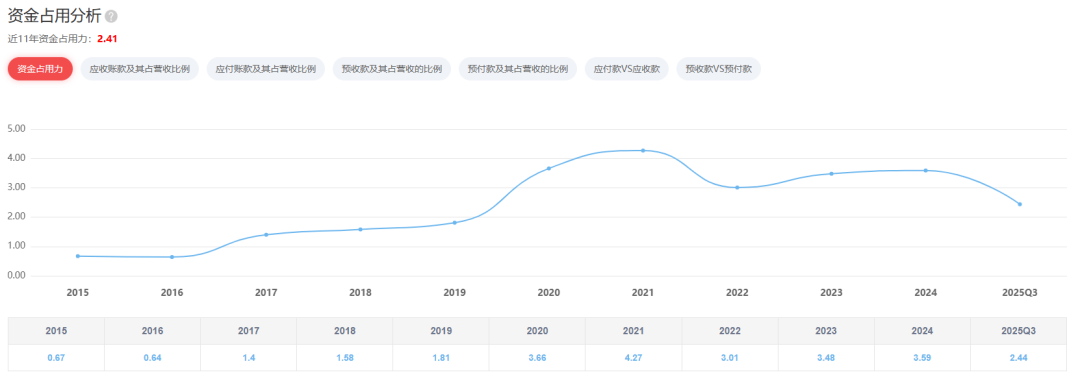 近11年公司资金占用2.41,表明公司在上下游产业链中具备较强的议价权。