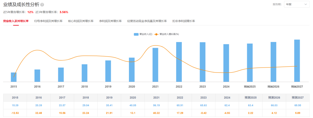 近5年公司营收复合增长率12%,近3年营收复合增长率3.56%;