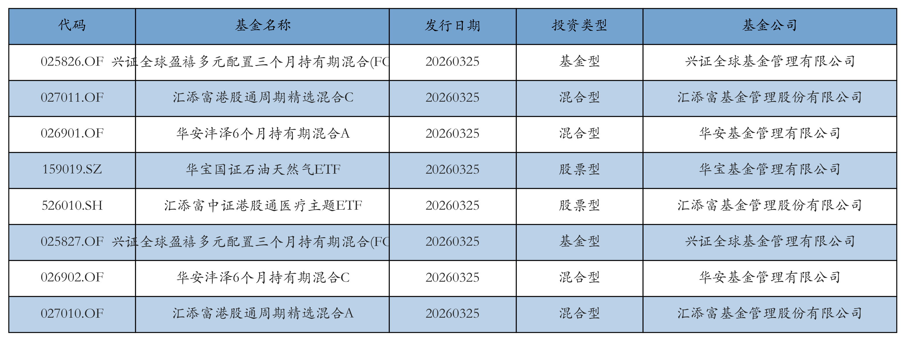 昨日有8只新基金发行,分别为:兴证全球盈禧多元配置三个月持有期混合(FOF)A、汇添富港股通周期精选混合C、华安沣泽6个月持有期混合A、华宝国证石油天然气ETF、汇添富中证港股通医疗主题ETF、兴证全球盈禧多元配置三个月持有期混合(FOF)C、华安沣泽6个月持有期混合C、汇添富港股通周期精选混合A,详情见下表: