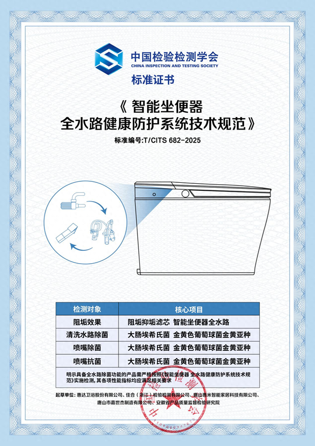 标准证书明确规定:“具备全水路除菌功能的产品需严格按照《智能坐便器全水路健康防护系统技术规范》实施检测,其各项性能指标均应满足相关要求。”